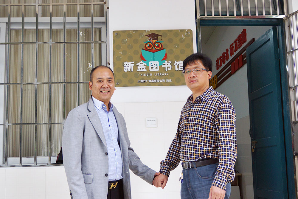 行葛岭中心小学。一跨进校门,就受到已在此等候的蔡品团校长、郑仕荣书记等校方师生的热烈欢迎。随后蔡校长带郑新金一行参观了“新金图书